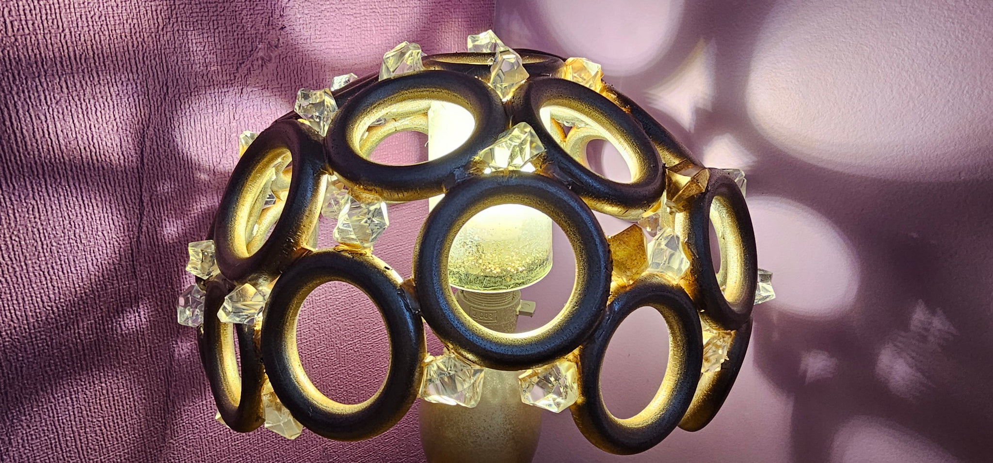 Made by me recycling wooden curtain rings , a lamp base and acrylic crystal stones